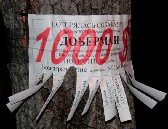 «Про-па-ла со-бач-ка по кли-чке Кле-па. На-шед-ше-го ж-дет воз-наг-раж-де-ние. Зво-нить по те-ле-фо-ну...»